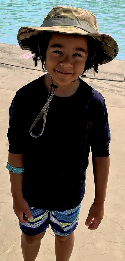 - SAFARI HAT - Kids Safari Floppy Sun Bucket Lightweight Hat for Backyard Outdoor Adventure for Boys & Girls. Sure Fit Adjustable Head Band Expands to fit children ages 8-11, Wide Brim for All Weather Sun Protection, Brightly Colored Hat Band for High Visibility, Adjustable Chin Strap with Quick Release Tab, Roomy Crown, and Large Mesh Ventilation Panels. Camo Medium/Large