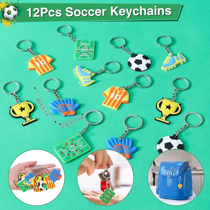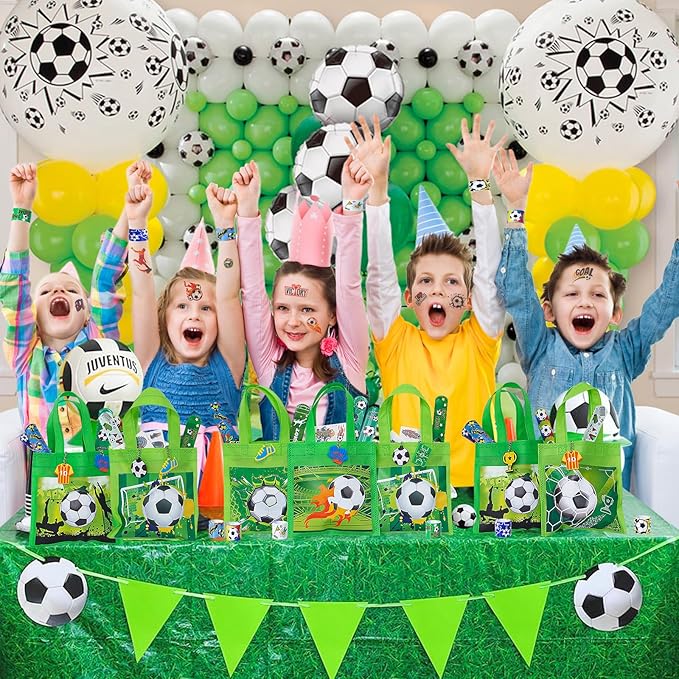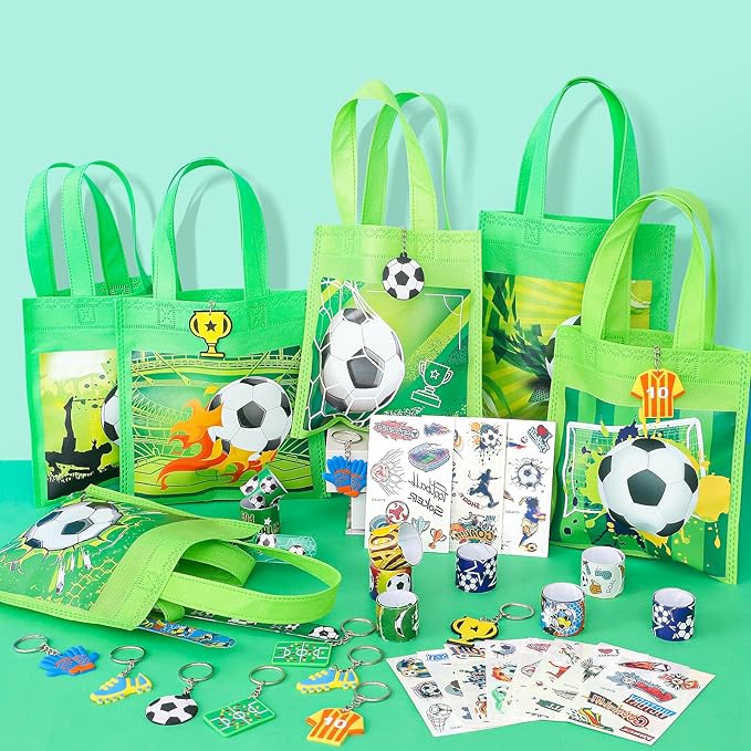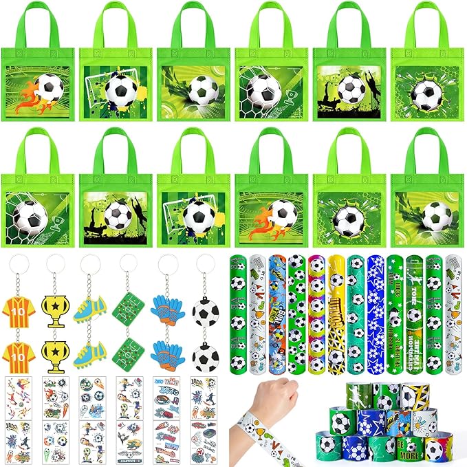 - Soccer Birthday Party Favors - It's soccer time! Our set of soccer party favors are packed with fun and practicality. The soccer non-woven bag has a large capacity, which allows children to carry items easily. Keychains have different shapes. Stickers and slap bands catch kids' attention instantly. Whether you're celebrating a birthday, hosting a tournament, or just getting together with friends to watch games, these party favors will add an extra element of fun and excitement to your event