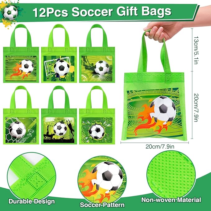 - 48Pcs Soccer Party Favors Supplies - You will get 12 non-woven soccer goodie bags, 12 soccer keychains, 12 soccer temporary tattoo stickers, 12 soccer theme slap bands. From personalized soccer treat bags to stickers, these favors will not only add to the decor, but also provide your guests with a keepsake. Your kids, especially those who like to play soccer, will love these fun and unique soccer gifts. Make your soccer party unforgettable with these amazing soccer party favors
