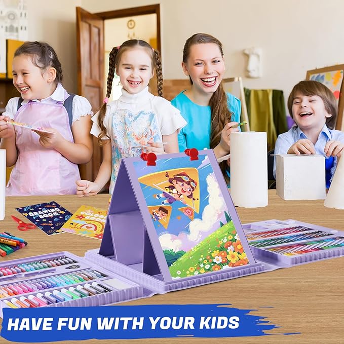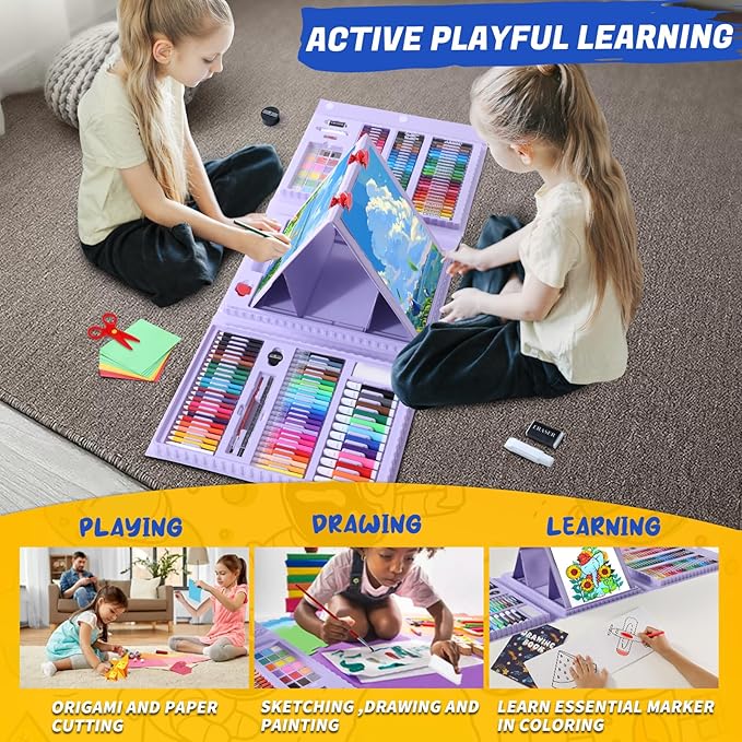 All in One Art Supplies, Art Kit Includes Easel, Origami Paper, Colored Pencils, Crayons, Drawing Book, Coloring Book, Watercolor Pens, Markers and Oil Pastels, Gifts for Girls Boys Teens, Purple