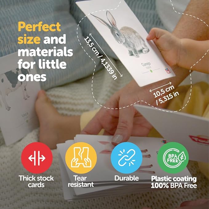 - THICK AND STURDY CARDS: These thick stock cardboard flash cards are laminated with BPA-free plastic coating, making them non-toxic and durable, ideal for baby development toys. Safe for little hands and built to withstand frequent use. PERFECT SIZE: Measuring 5.3 inches tall and 4.1 inches wide, these cards are easy to handle, lightweight, and portable. They come with a carrying bag for on-the-go learning, ideal for travel toddler activities.