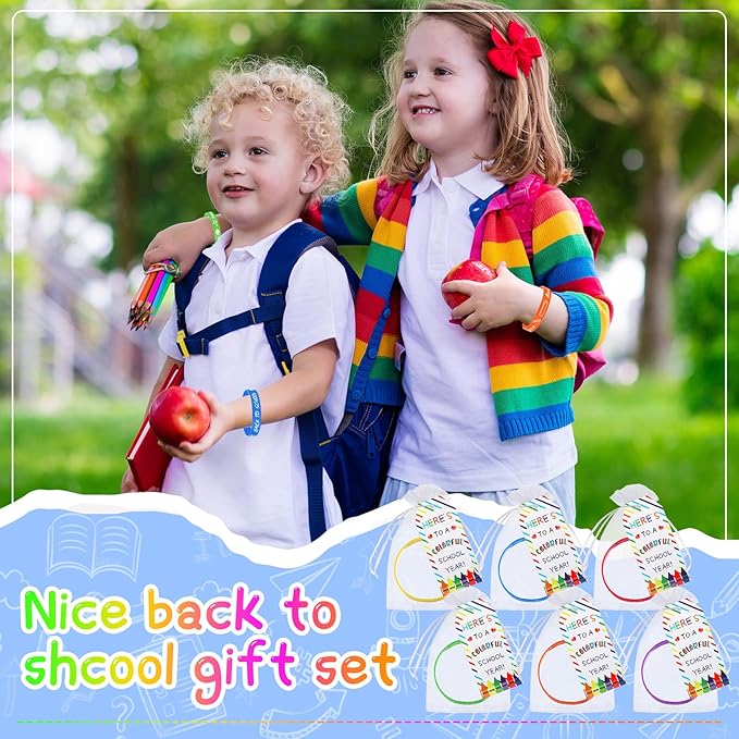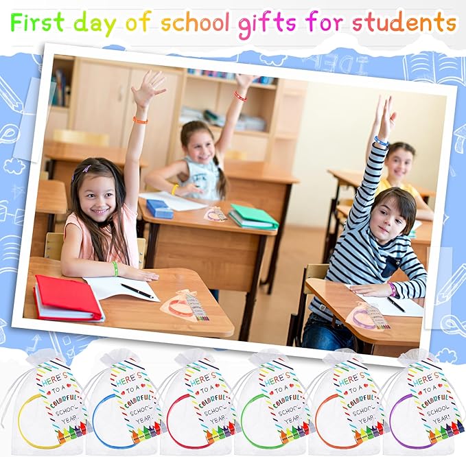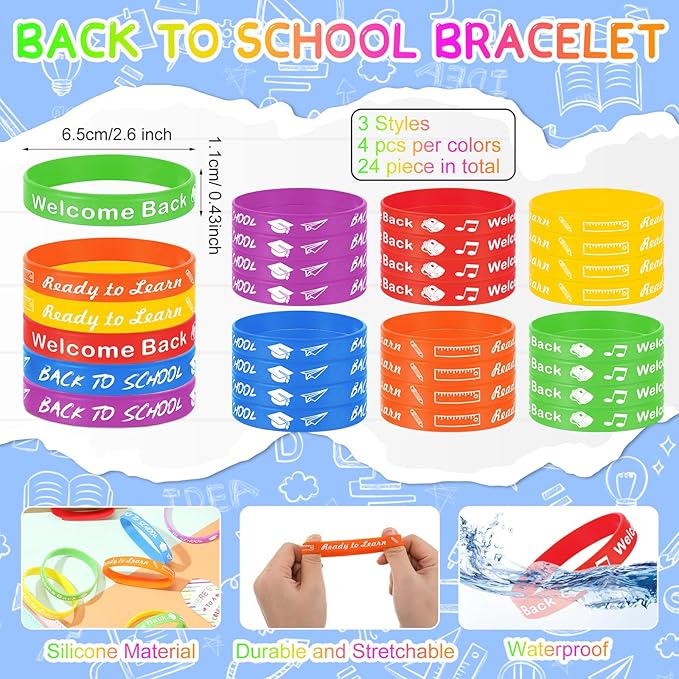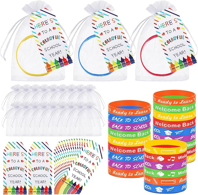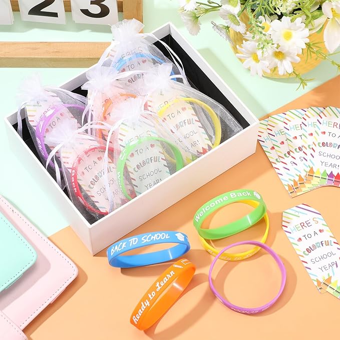 - Back to School Gift Set: you will receive 24 pieces of welcome back to school silicone bracelets for kids in 3 styles and 6 colors, 24 pieces of gift tags and 24 pieces of organza bags, sufficient gift sets that can be easily distributed to students and welcome them back to school
