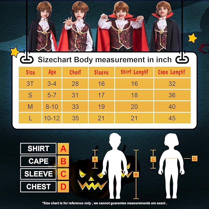 - [Vampire Costume Material] - Vampire Costume is Made of 100% Comfortable Polyester. Suitable for toddlers and kids. Realistic look, super durable Perfect Details and Stitching Crafts. Meets our Dress Size Standard