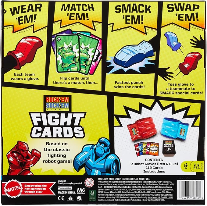 Mattel Games Rock ‘Em Sock ‘Em Robots Fight Cards Card Game, Team Party Game for Kids & Adults with 2 Boxing Gloves