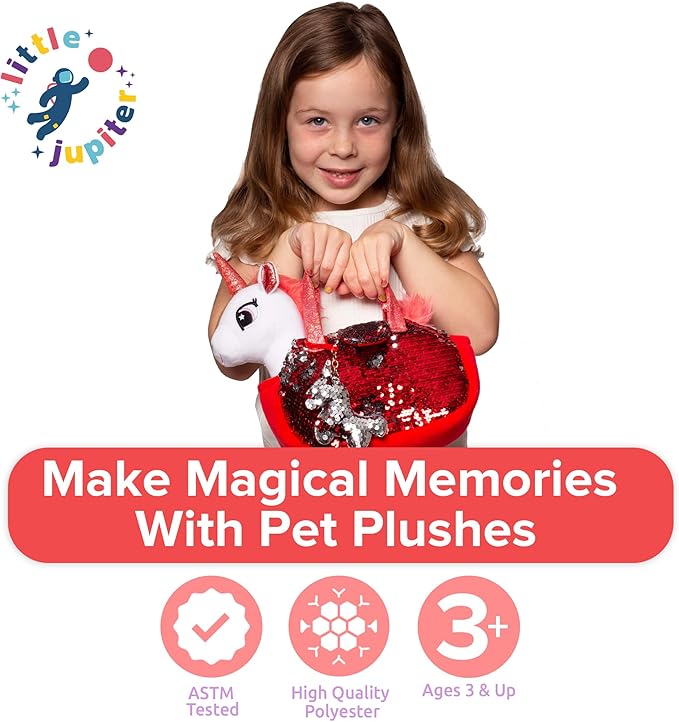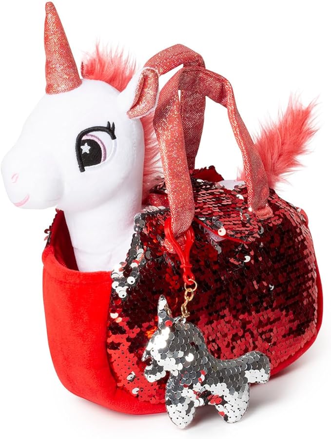 - Flippable Sequin Bag: Girls will love the mini pet bag with reversible sequins & charm. The handbag features colorful sparkles that flip from pink to silver. An awesome stuffed unicorn for girls 4 & up. White and red makes a great valentines stuffed animal toy.