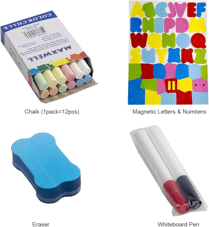 - πππππ¦π¦π’π₯πππ¦ ππ¨π‘πππ - This kids art easel includes: Chalk, Markers, Eraser, & Letters.