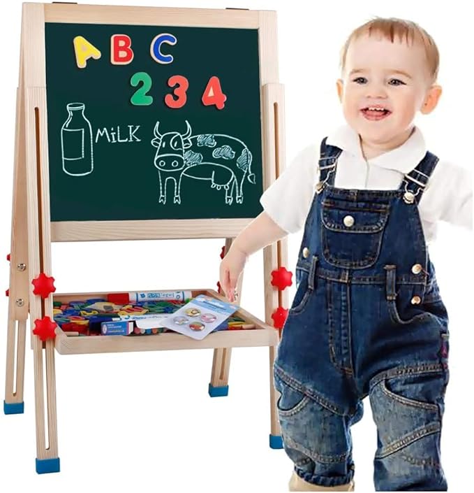 - 2-ππ‘-π β This kids painting easel features a magnetic chalkboard easel for kids on one side, a kid's magnetic white board on the other side.