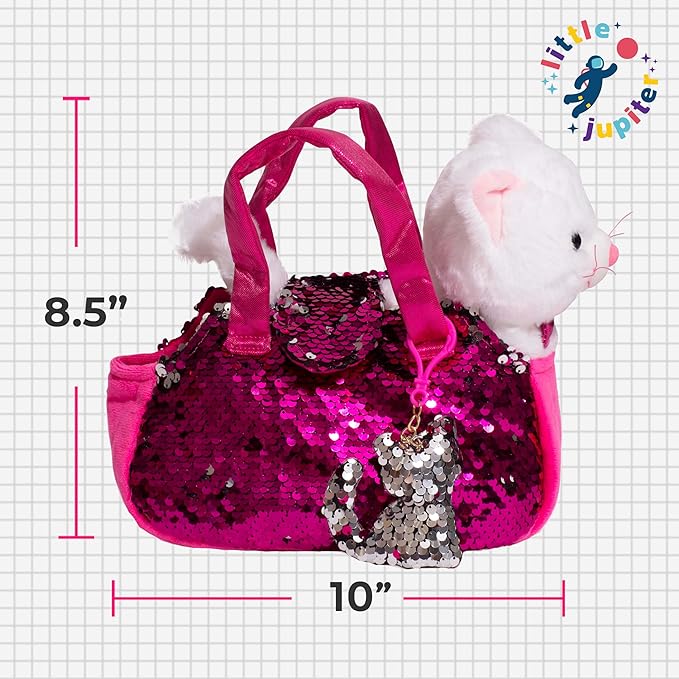 Little Jupiter Plush Pet Set with Purse - Stuffed Cat Plush Pet Carrier Set w/Reversible Sequins & Charm - Cat Stuffed Animals - Cat Animal Plush - Stuffed Animal Cat - Plush Cat (White Cat)