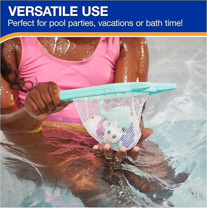 - FUN POOL GAME: Toss the characters into the pool then swim to retrieve them with the folding net - each character floats at different depths, adding to the fun of catching them!