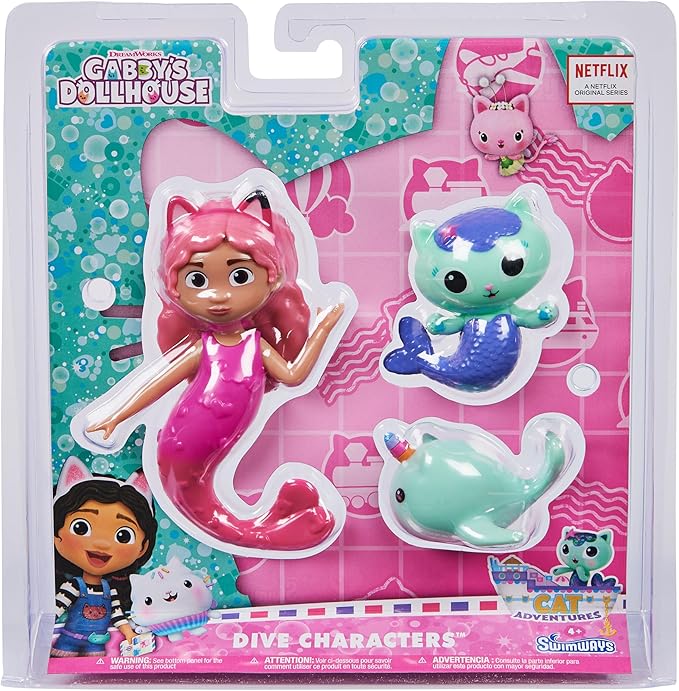- GABBY'S DOLLHOUSE POOL DIVING TOYS: Soft and flexible diving toys with your favorite characters from Gabby's Dollhouse! Includes 1 Gabby, 1 Mercat and 1 Kitty Narwhal dive sticks!