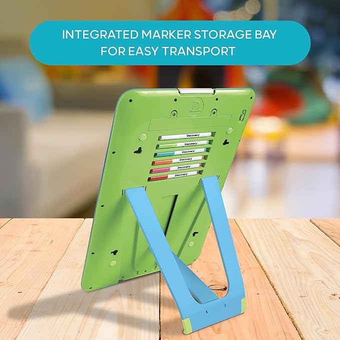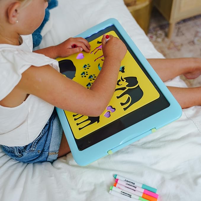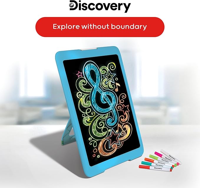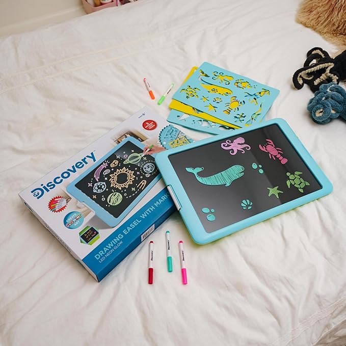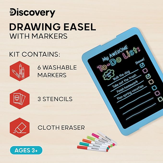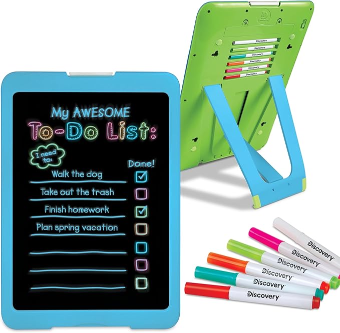 Discovery Kids Neon Glow Drawing Easel w/ 6 Color Markers, Built-in Kickstand/Wall Mount, 5 Light Modes, Easy Clean/Washable, Wide Screen, Flat Storage, Portable Travel Activity, Electronic Activity