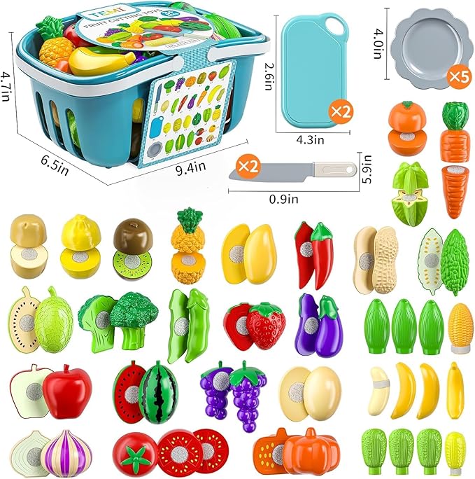 - Pretend Play Food Set: The 70 pieces play kitchen(9.4*6.5*4.7in) accessories contains 26 different kinds of play fruit and vegetables, 1 toy grocery basket, 2 cutting boards, 2 kitchen knives, and 5 dinner plates. Very suitable for girls to pretend play