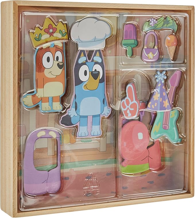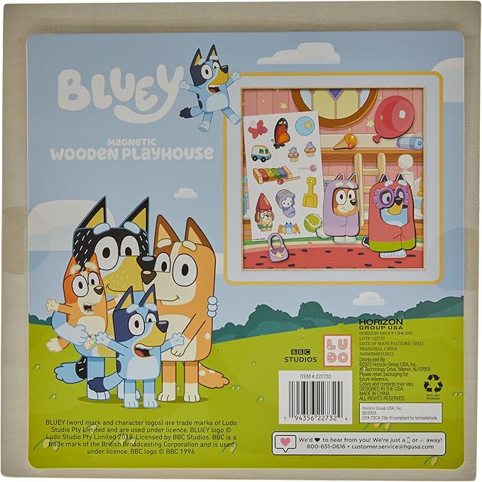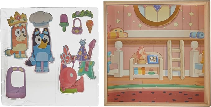 - SET INCLUDES: 2 Magnetic Wooden Dolls (Bluey, Bingo), 1 Wooden Playhouse (11 in. x 2 in. x 11 in.), 12 Magnetic Accessories, 1 Repositionable Sticker Sheet, 2 Double-Sided Background Insert (11 in. x 11 in.), Easy-to-Follow Instructions