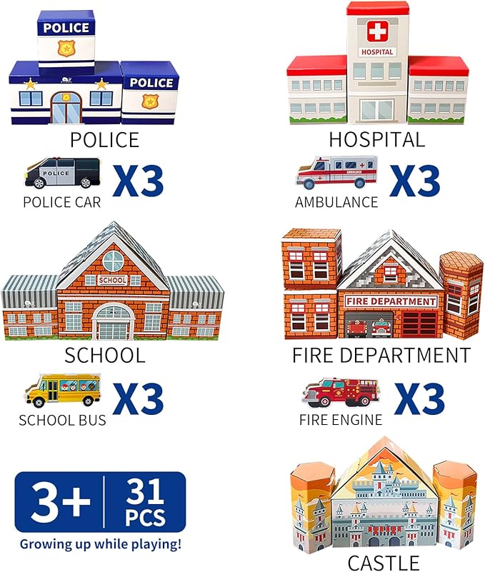 - 【Deluxe Jumbo Cardboard Building Blocks】31 cardboard building blocks in total with different colors and shapes, specially designed into 5 common buildings in our life, fire department, castle, school, police and hospital, and corresponding vehicles, fire engines, school buses, police cars and ambulances. Sufficient quantity and diverse designs can meet children’s needs greatly and help them develop creativity and imagination.