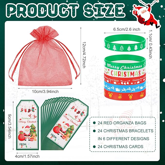 - Size Information: Christmas silicone wristbands are approx. 2.56 inches in diameter; And the size of the gift cards is about 1.57 x 3.54 inches/ 4 x 9 cm and mesh organza bags are approx. 3.94 x 4.72 inches/ 10 x 12 cm