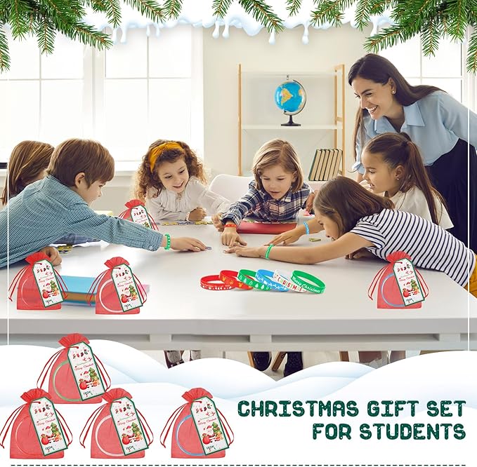 Liliful 72 Pcs 24 Set Christmas Students Gifts, Christmas Silicone Wristbands with Gift Label Tags and Organza Bags for Kids Christmas Stocking Stuffers Classroom Gifts Party Favors