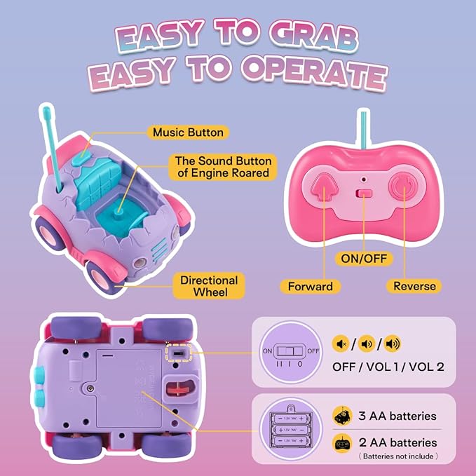 - 【Easy To Control】The cars are easy to control through 2 big directional buttons to move forward and backward. 3 fun musics can be change or pause by pressing the music button.The toddler remote control car requires 3 AA batteries and the remote control requires 2 AA batteries(not included). Place the batteries in both vehicles and controllers and watch your toddlers have endless fun