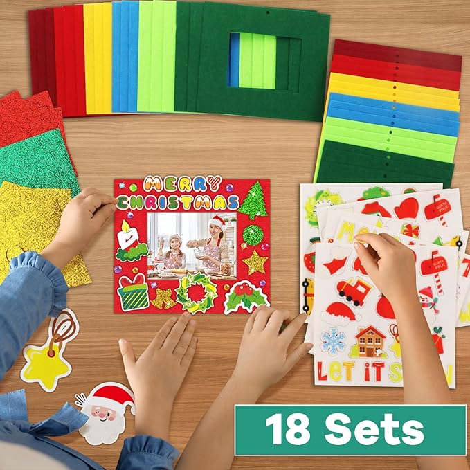 - 【Package Include】For each set, you will get 18 packs Christmas picture frames designed in 8 different styles; and the package comes with over 300 self-adhesive felt stickers, over 180 pieces glitter felt stickers, over 250 pieces diamond gem stickers, and 18 colorful ribbons, they are enough for you to enjoy your DIY time!