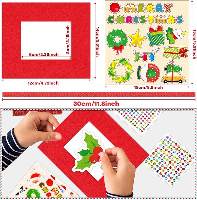 - 【Premium Material & Suitable Size】These well-printed kids Xmas holiday DIY felt art crafts kit are made of durable felt that tear-resistant. Each Christmas picture frame measures about 12*14cm/4.7 x 5.5inch with a 8 x 6cm/3 x 2.4inch picture shown space. Each Christmas sticker piece measures about 2cm-4cm/0.8-1.6inch. Each Xmas felt craft picture frame has a folder behind it.
