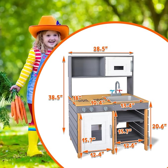 - [PLENTY OF STORAGE]:There is a large storage area for children to collect their handmade mud food and other toys. Our mud kitchen also has two storage shelves under the sink. Total Product Dimensions: 38.5"(L) x 28.5"(W) x 18"(H)