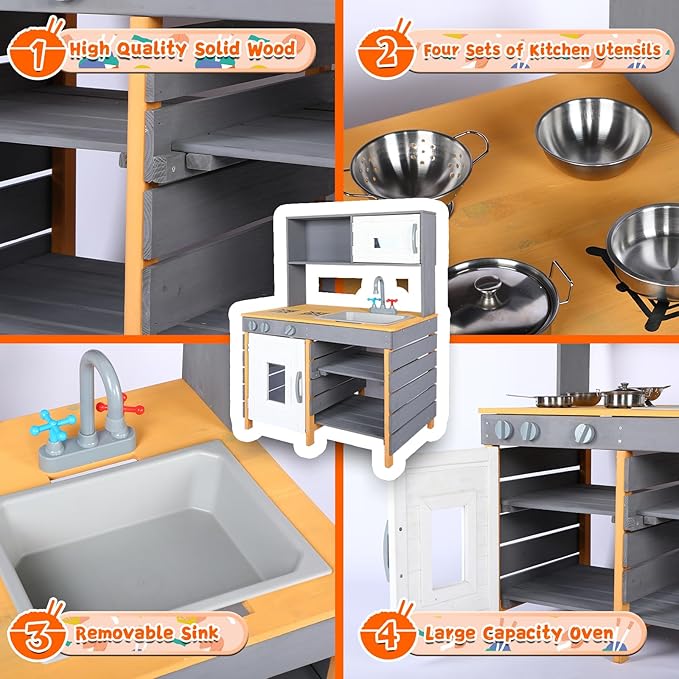 - [SELECTED SOLID WOOD]:elected fir wood material, sturdy and durable. Our mud kitchen is supported by 4 solid legs to keep it stable and not easy to wobble. The rounded corners prevent children from bumping into it while playing.The surface of the product is carefully polished to prevent wood splinters from hurting children's skin.