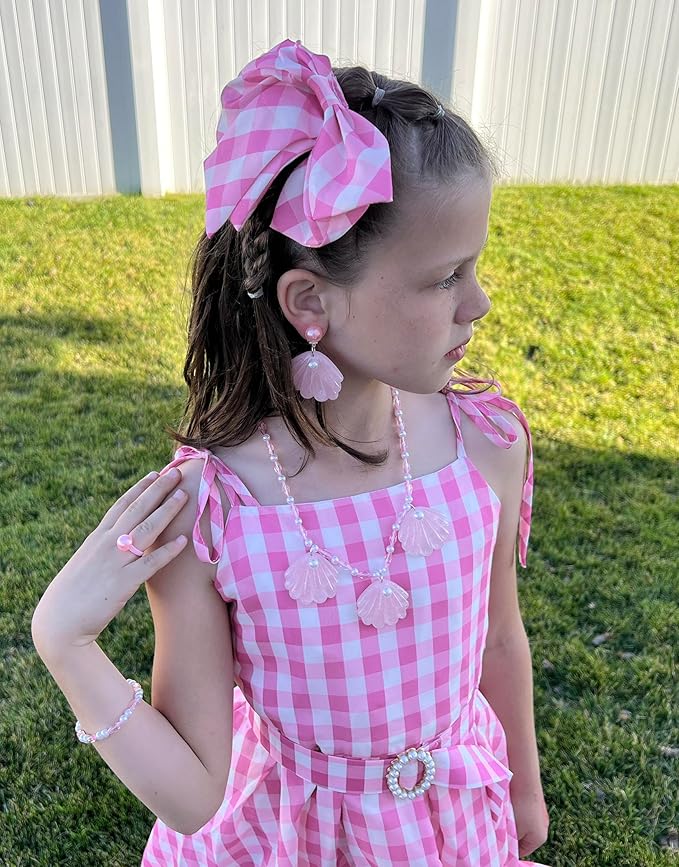 - 7 Pieces Deluxe Girls Princess Dress Set Includes: 1xPink and White Gingham Dress, 1xPearl Buckle Waistband, 1xCute Detachable Bowknot Hair Clip, 1xShell Necklace, 1xShell Earrings, 1xBracelet, 1xPearl Ring