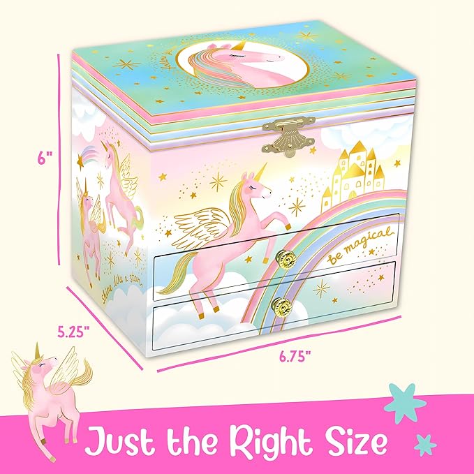 - Fine Craftsmanship - Made with sturdy pine fiberboard & tested for safety, this jewelry box for kids is built to last. The spinning unicorn music box for girls complies with all CPSIA, ASTM, and EN71 guidelines ensuring the wellbeing of any child