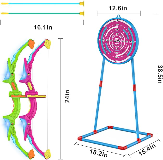 - 2023 Newest bow and arrow: Our archery set for kids includes 2 main bow body with led lights that can disassemble and install within 1s easily, improved 14 large suction cup arrows that can increase the suction function and big sucker can be adsorbed on the smooth glass, wall, and targets 1 luminous standing target that can glow in the Dark. A good toys for girl boy gifts age 4 5 6 7 8-12 to play indoors and outdoors.2*AAA batteries needed(not included).