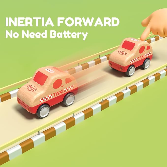 - 3 Wooden Cars: this playset comes with 3 colorful mini cars for your little driver to enjoy! Taxi, fire truck, city bus for playing different roles to drive different car toy with friends or partner.