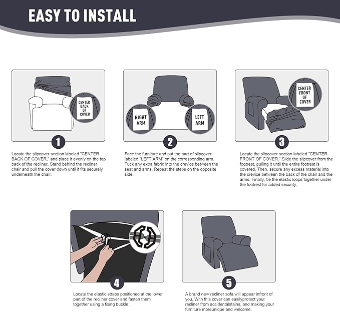- EASY TO INSTALL: Our recliner sofa slipcovers have exquisite workmanship, including 2 pieces arm covers, 1 piece seat cover and 1 piece back seat cover, 4 pieces cover totally. The recliner covers also equips with bottom elastic and reinforcement straps, you can use buckle to make the cover in place without moving