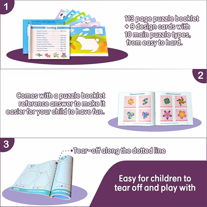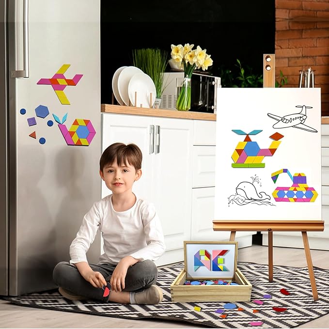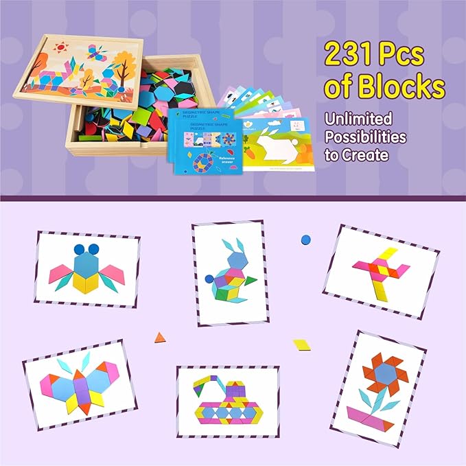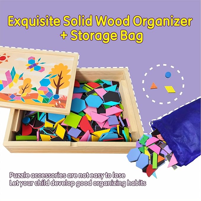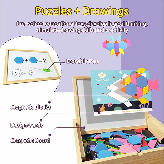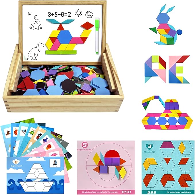 - Magnetic Tangram Set: Contains 231pcs pattern blocks, a 113-page puzzle book, a magnetic white-board and dry erasable pen, 9 pattern block cards, a wooden box and cloth bag for kids ages 3 and up to exercise geometric thinking and develop creativity
