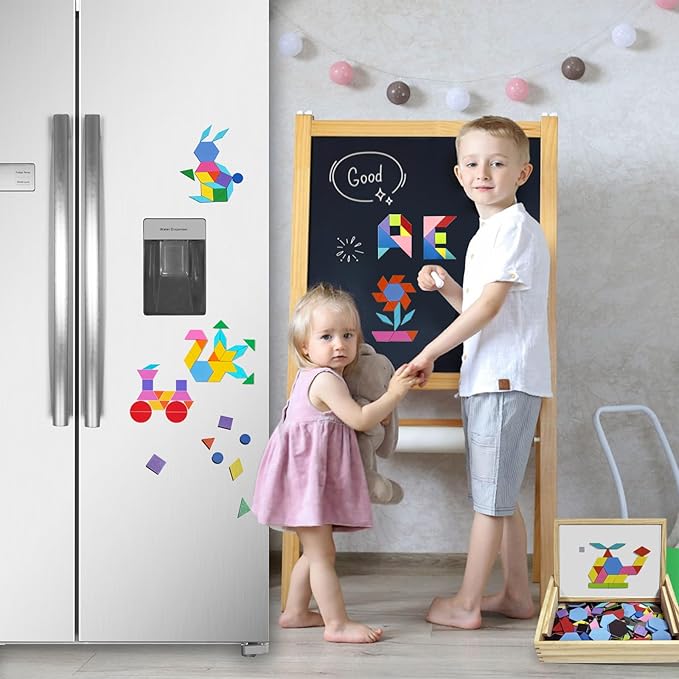 - Safe Material: Magnetic tangram set is made of high quality solid wood, safe and non-toxic, each wooden blocks with strong magnets, you can create as you like on whiteboards and fridges, perfect gift for tangram and pattern block lovers
