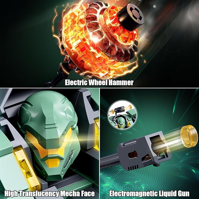 - Mech Building Kit: This mech model set has 542 pieces bricks.Let you get into the world of mechs with destroy warrior building kit, which inspired from a game.With electric wheel hammer,high translucency mech face and electromagnetic liquid gun,offering an good building experience.