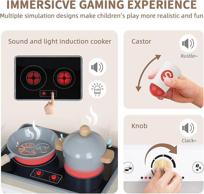 - FULLY EQUIPPED KITCHEN - Kids kitchen playset including sink with rotating tap, oven, tove,dishwasher, coffee maker, ice maker and microwave, also equipped with a variety of realistic cooking utensils such as soup pots, pans, shovel and spoons, stoves and microwave ovens have sounds and lights that simulate real cooking, and there are separate buttons to control on and off,wooden large play kitchen can meet the children's play needs and make pretend games more lively
