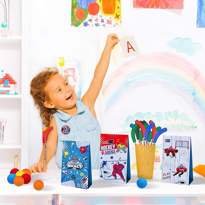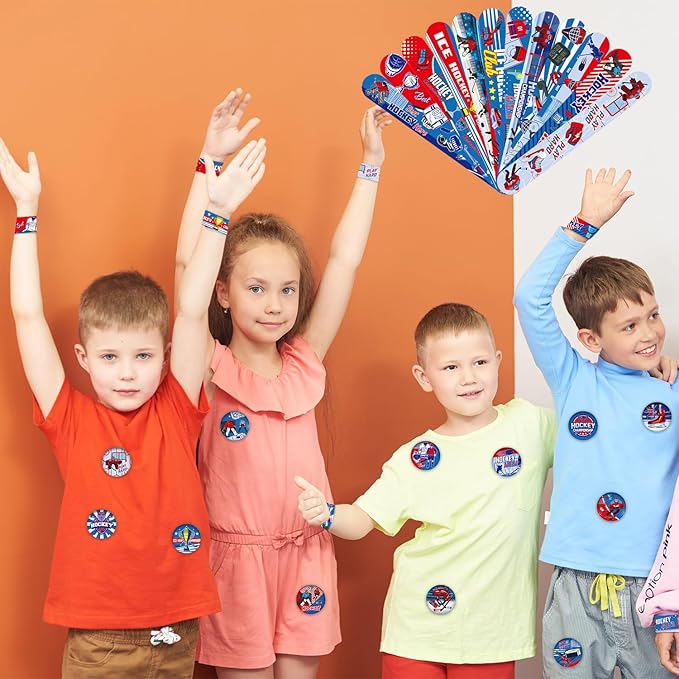 - Suitable Size: The hockey goodie bags measure about 11.4cm/4.4” * 21cm/8.2’’; Hockey button badges measure about 3.8cm/1.5inch in diameter; Hockey slap bracelets measure about 8.5inch * 1.2inch, and Hockey pencils are 9 inches tall.