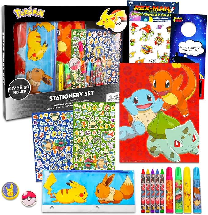 • This Pokemon stationery set comes with 4 markers, 2 erasers, 1 pencil pouch, 1 sketch pad (10 sheets), 100+ Pokemon stickers, 1 pencil, and other coloring supplies.