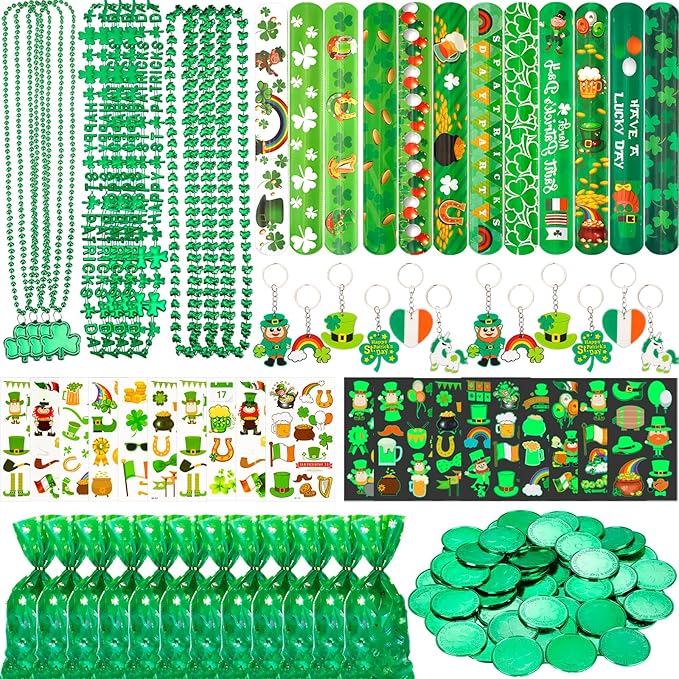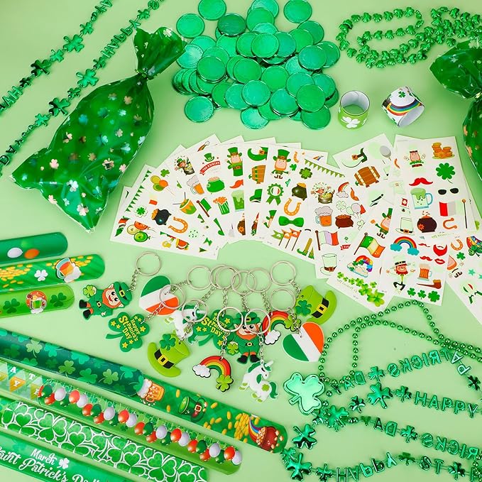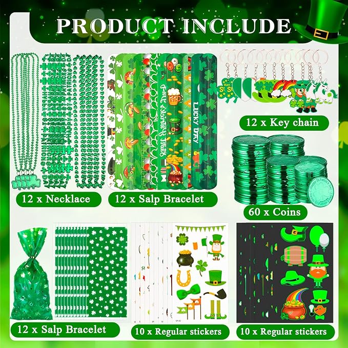 - ☘️【Reliable Material】 St. Patrick's Day coins, clover necklaces, slap bracelets are made of high quality plastic, strong and durable, not easy to break, can be used for a long time; green St. Patrick's Day gift bags and tattoo stickers are made of safe and non-toxic materials; keychains are made of silicone, you can rest assured that they are lightweight and reliable