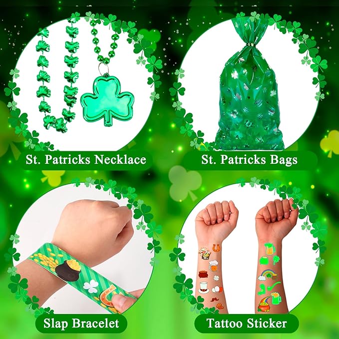 St. Patrick's Day Party Accessories Favor Set Including Luminous Tattoo Stickers, Necklaces, Slap Bracelets, Shamrock Coins, Keychains, Gift Bags for St. Patrick Irish Party Supplies Favors Decor