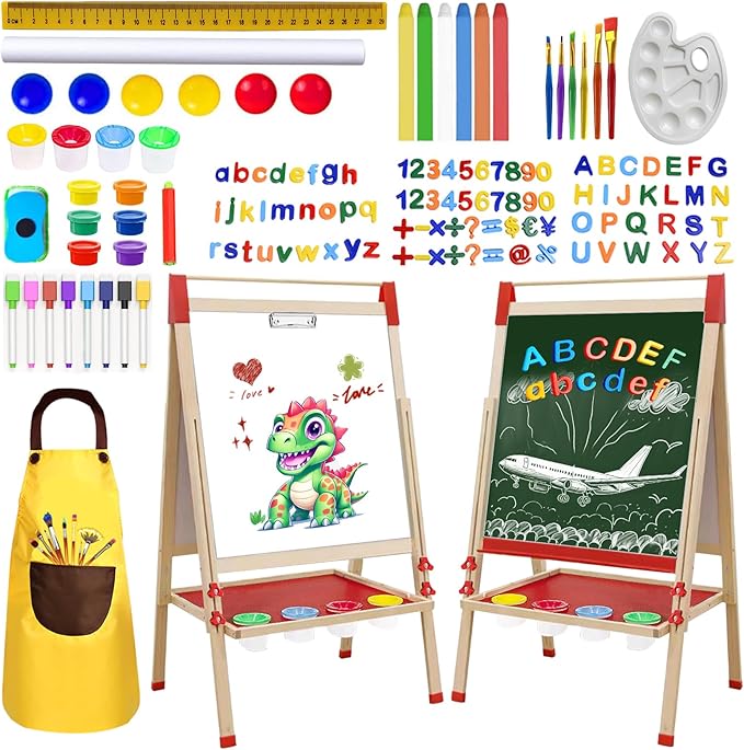 Wooden Art Easel for Kids and Toddlers, Double-Sided with Magnetic Drawing Board, Adjustable Height, Includes Magnetic Letter & Number Set and Paper Roll.