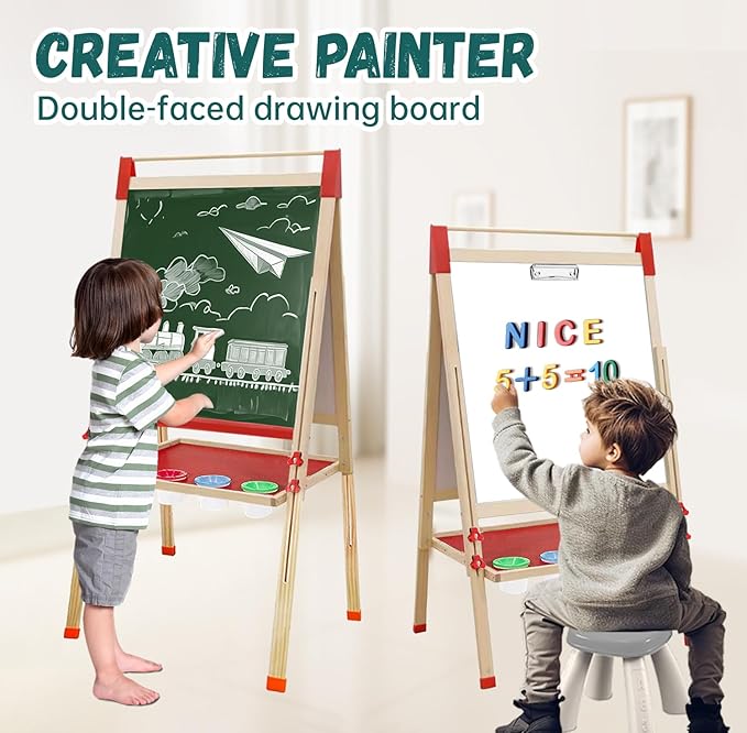 - Sustainable and Safe: Crafted from non-toxic and eco-friendly materials, our wooden art easel ensures a safe and healthy creative environment for your child. The use of sustainable wood not only promotes environmental consciousness but also guarantees durability, allowing your child to enjoy countless hours of artistic exploration while minimizing the impact on the planet.
