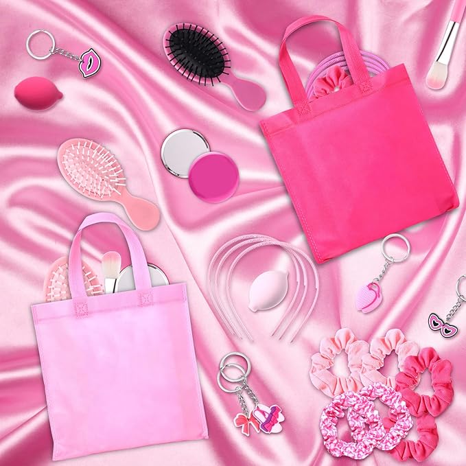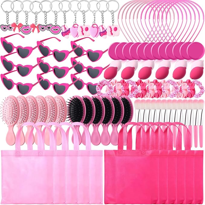 - Comprehensive Party Kit: this kit contains 108 pcs items, including 12 keychains, 12 small compact mirrors, 12 makeup brushes, 12 sponges, 12 party favor bag for girls, 12 heart sunglasses, 12 hair brushes, 12 headbands, and 12 hair ties; This complete package serves as a gift catering for all your party favor needs for birthday party, slumber party, or princess theme party