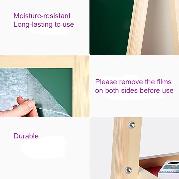 - ASSURED QUALITY – This art easel for kids is made of durable pine wood. Well-constructed easel in triangular type with perfect craftsmanship is sturdy when painting, you can count on it holding up after years of use. All materials are eco-friendly, passed CPSC will not cause any harm to children. 2 sides with blackboard & white board
