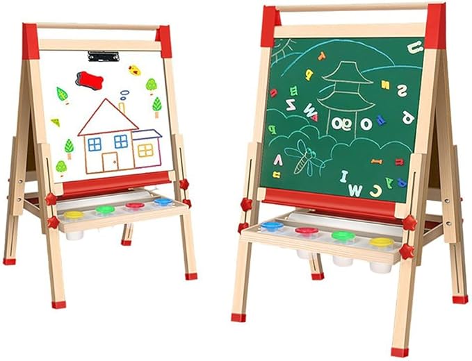 - ASSURED QUALITY – This art easel for kids is made of durable pine wood. Well-constructed easel in triangular type with perfect craftsmanship is sturdy when painting, you can count on it holding up after years of use. All materials are eco-friendly, passed CPSC will not cause any harm to children. 2 sides with blackboard & white board