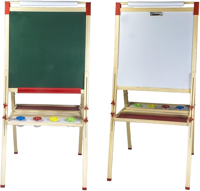 - ASSURED QUALITY – This art easel for kids is made of durable pine wood. Well-constructed easel in triangular type with perfect craftsmanship is sturdy when painting, you can count on it holding up after years of use. All materials are eco-friendly, passed CPSC will not cause any harm to children. 2 sides with blackboard & white board