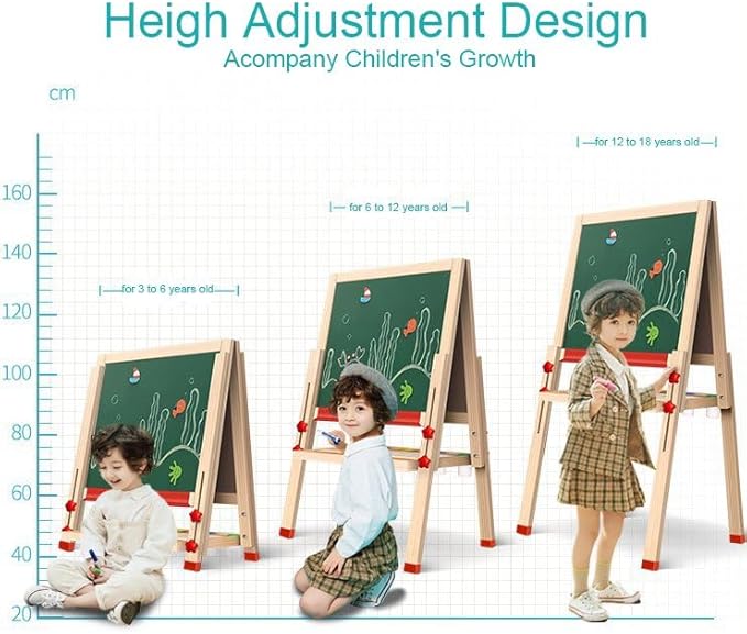 - 𝗔𝗗𝗝𝗨𝗦𝗧𝗔𝗕𝗟𝗘 𝗛𝗘𝗜𝗚𝗛𝗧 The legs are easily height adjustable, from 90cm (35.4") to 165cm (65"), making it the perfect standing easel for children of all ages, from a toddler easel to a 16-year-old easel.