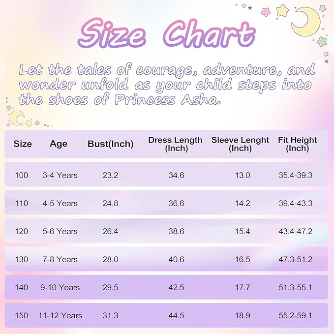 - Size Options: Our attire is available in a range of sizes, specifically crafted for girls aged 3 to 12. These size choices ensure that Asha's fans of diverse ages and body types can wear it comfortably and with a perfect fit, enabling young enthusiasts of the "Wish" movie to fully immerse themselves in their favorite character.
