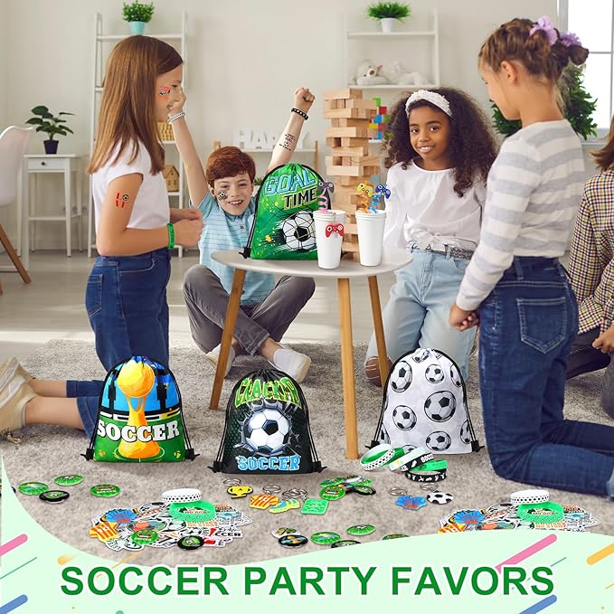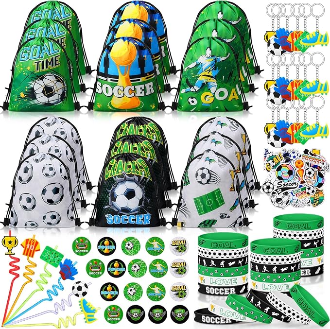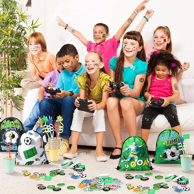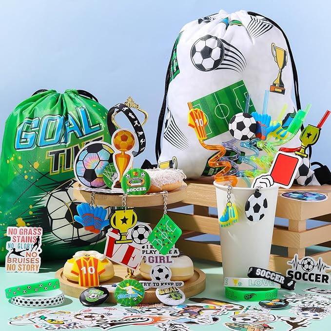 - Sufficient for Your Party: our soccer themed video game party favors include 18 drawstring bags, 18 silicone bracelets, 18 drinking straws, 18 soccer themed keychains, 18 button pins, and 50 soccer stickers with various patterns; Ideal for a soccer theme party, these favors will heat your celebration and make it unforgettable