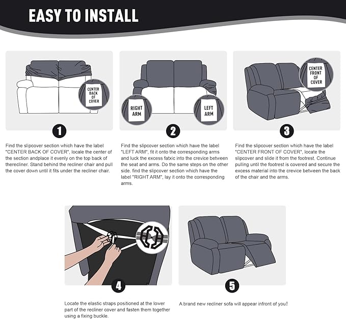- EASY TO INSTALL: Our loveseat recliner covers have exquisite workmanship, a total of 6 pieces set, including 2 seat covers, 2 armrest covers, 2 cushion covers. The recliner covers also equips with bottom elastic and reinforcement straps, you can use buckle to make the cover in place without moving