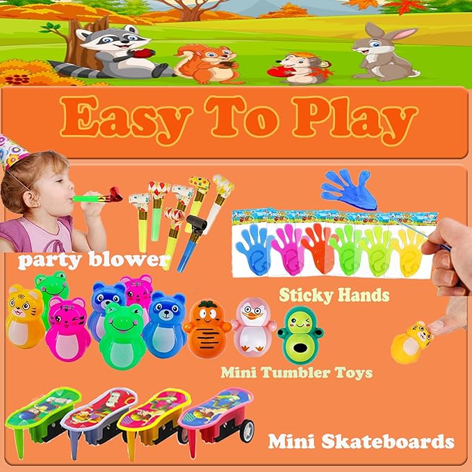 - Assortment Party Favors Toys Set: Assortment premium party favors toys set include 10 slap bracelets, 10 party blower, 6 sticky hands, 5 tumbler toys, 5 bouncy balls, 5 pull back cars, 5 mochi squishys, 5 mini skateboards, 4 pop keychain, 4 soccer spinner, 4 puzzle, 4 maze puzzle, 50 animal stickers. Total 117 Pcs toys for kids classroom prizes.