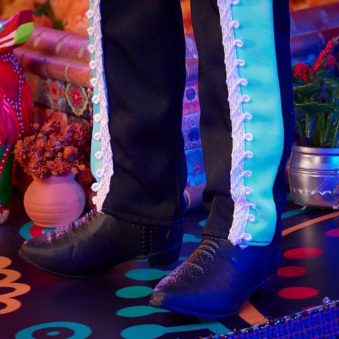 - A glossy black sombrero accentuates his blue-toned calavera face paint, while a sugar skull belt and matching shoes complement his festive look.